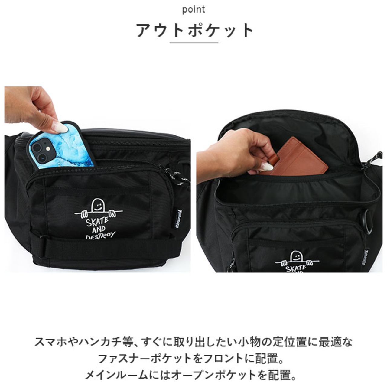 ・スマホやハンカチ等、すぐに取り出したい小物の定位置に最適なファスナーポケットをフロントに配置。メインルームにはオープンポケットを配置。