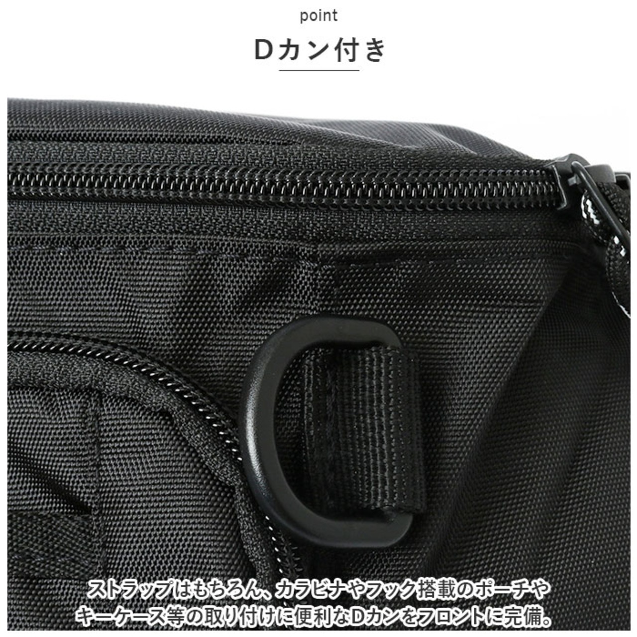 ・ストラップはもちろん、カラビナやフック搭載のポーチやキーケース等の取り付けに便利なDカンをフロントに完備。