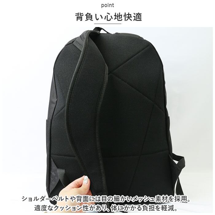 ・ショルダーベルトや背面には目の細かいメッシュ素材を採用。適度なクッション性があり、体にかかる負担を軽減。