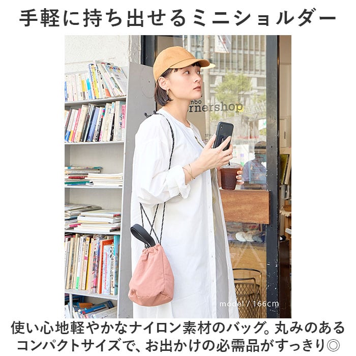 ・使い心地軽やかなナイロン素材のバッグ。丸みのあるコンパクトサイズで、お出かけの必需品がすっきり◎