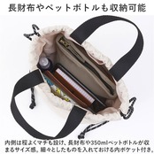 ・内側は程よくマチも設け、長財布や350mlペットボトルが収まるサイズ感。細々としたものを入れておける内ポケット付き。