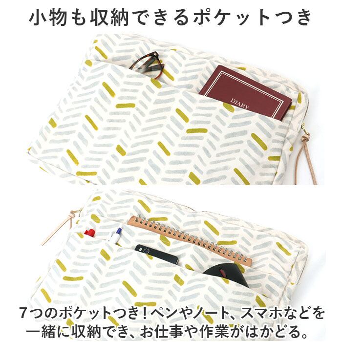 7つのポケットつき!ペンやノート、スマホなどを一緒に収納でき、お仕事や作業がはかどる。