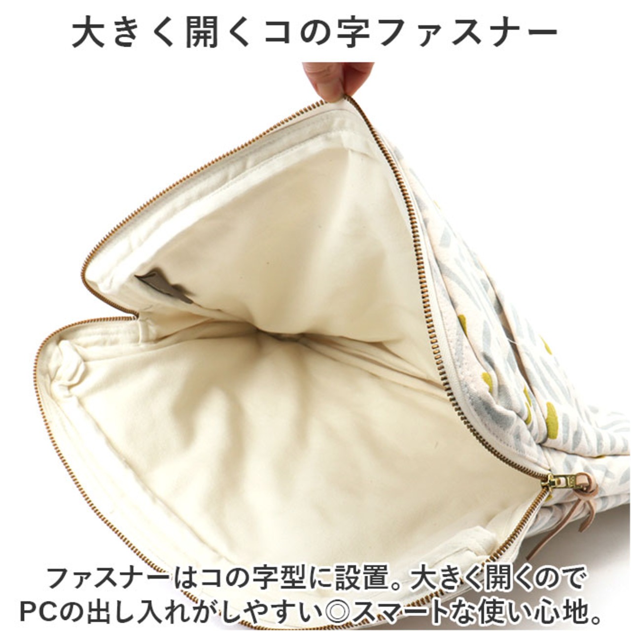 【大きく開くコの字ファスナー】