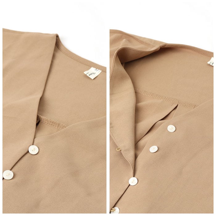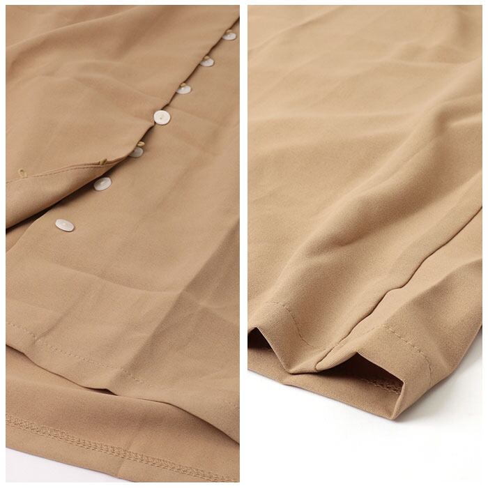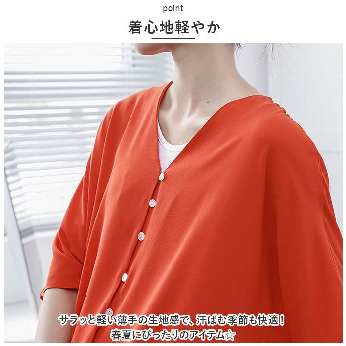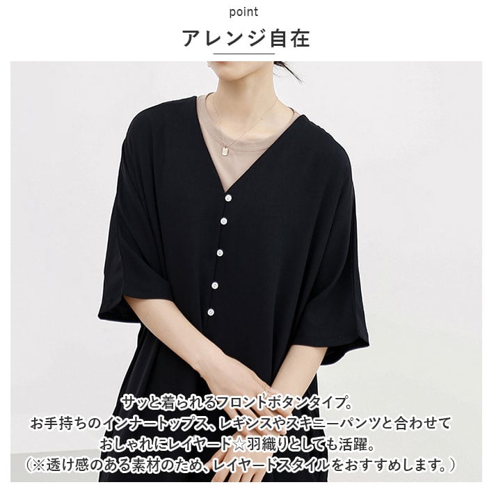 ・サッと着られるフロントボタンタイプ。お手持ちのインナートップス、レギンスやスキニーパンツと合わせておしゃれにレイヤード☆羽織りとしても活躍。(※透け感のある素材のため、レイヤードスタイルをおすすめします。)