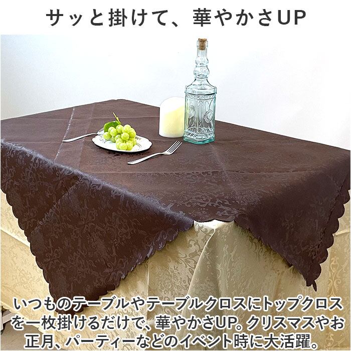 ・いつものテーブルやテーブルクロスにトップクロスを一枚掛けるだけで、華やかさUP。クリスマスやお正月、パーティーなどのイベント時に大活躍。