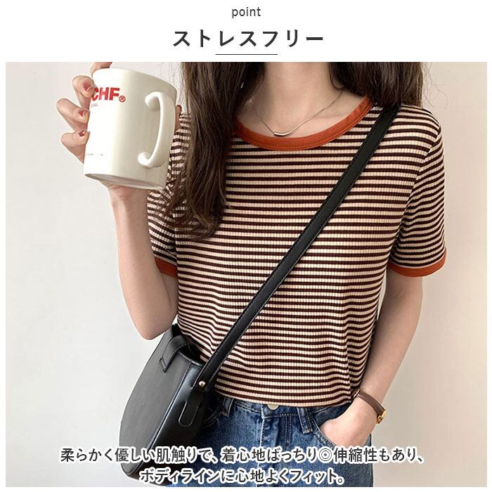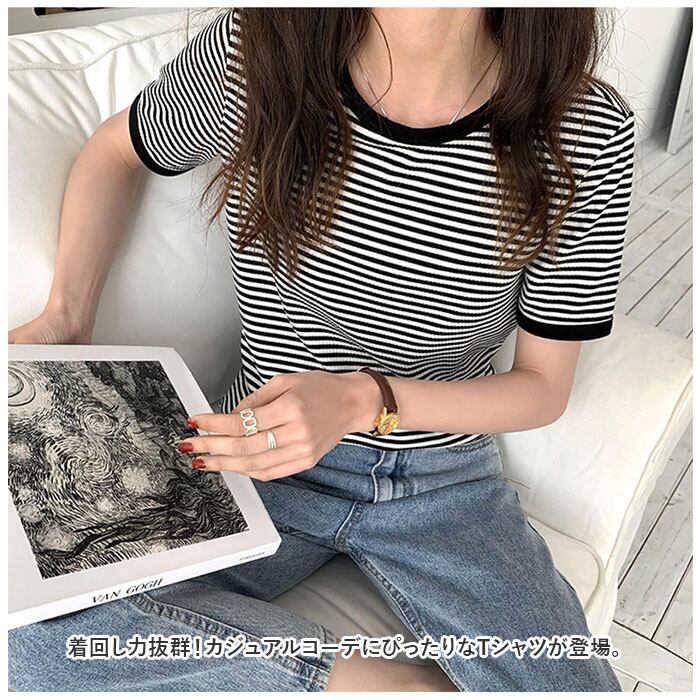半袖tシャツ レディース 通販 シャツ カットソー Tシャツ リンガーtシャツ リブボーダー トップス Uネック ラウンドネック 無地 シンプル カジュアル おしゃれ 大人 可愛い 春 夏
