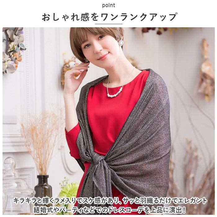 ・キラキラと輝くラメ入りでスケ感があり、サッと羽織るだけでエレガントさをワンランクアップし、結婚式やパーティなどでのドレスコーデを上品に演出!