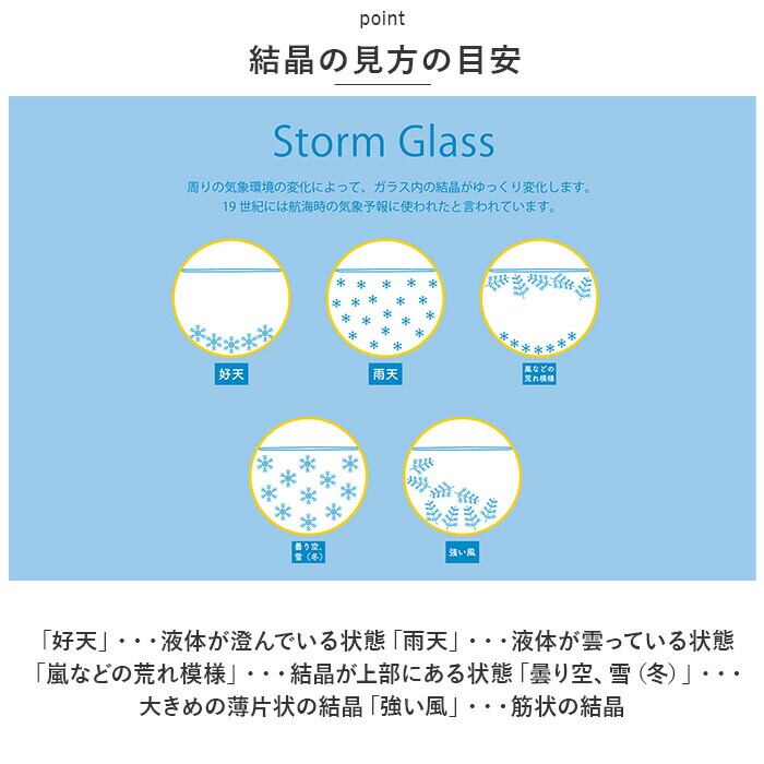 ・数種類の化学薬品をアルコールに溶かしてガラス容器に詰めたもので、天候や気温などによって液体内の結晶の様子が変化するのが特徴。