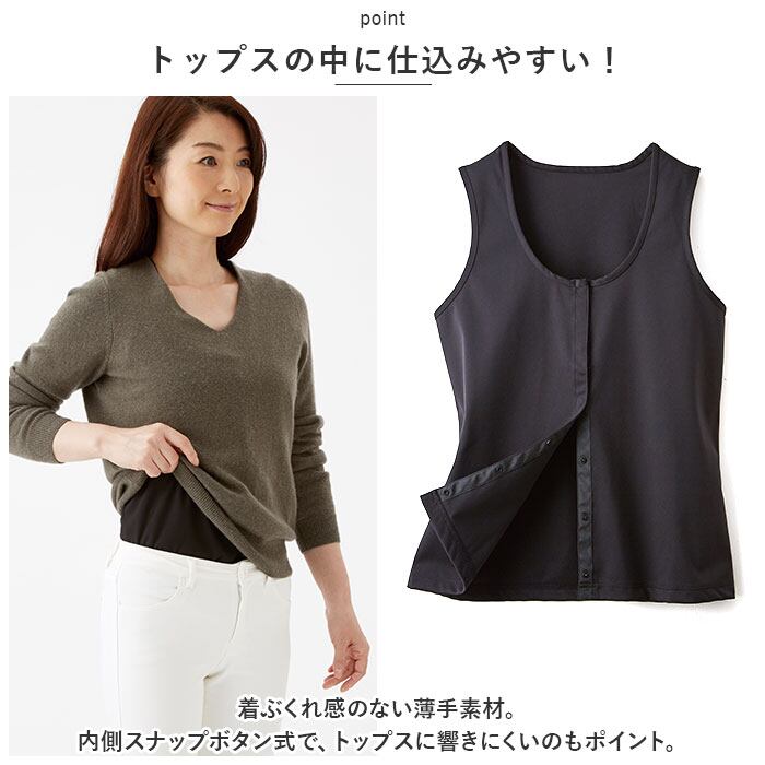 ・着ぶくれ感のない薄手素材。内側スナップボタン式で、トップスに響きにくいのもポイント。