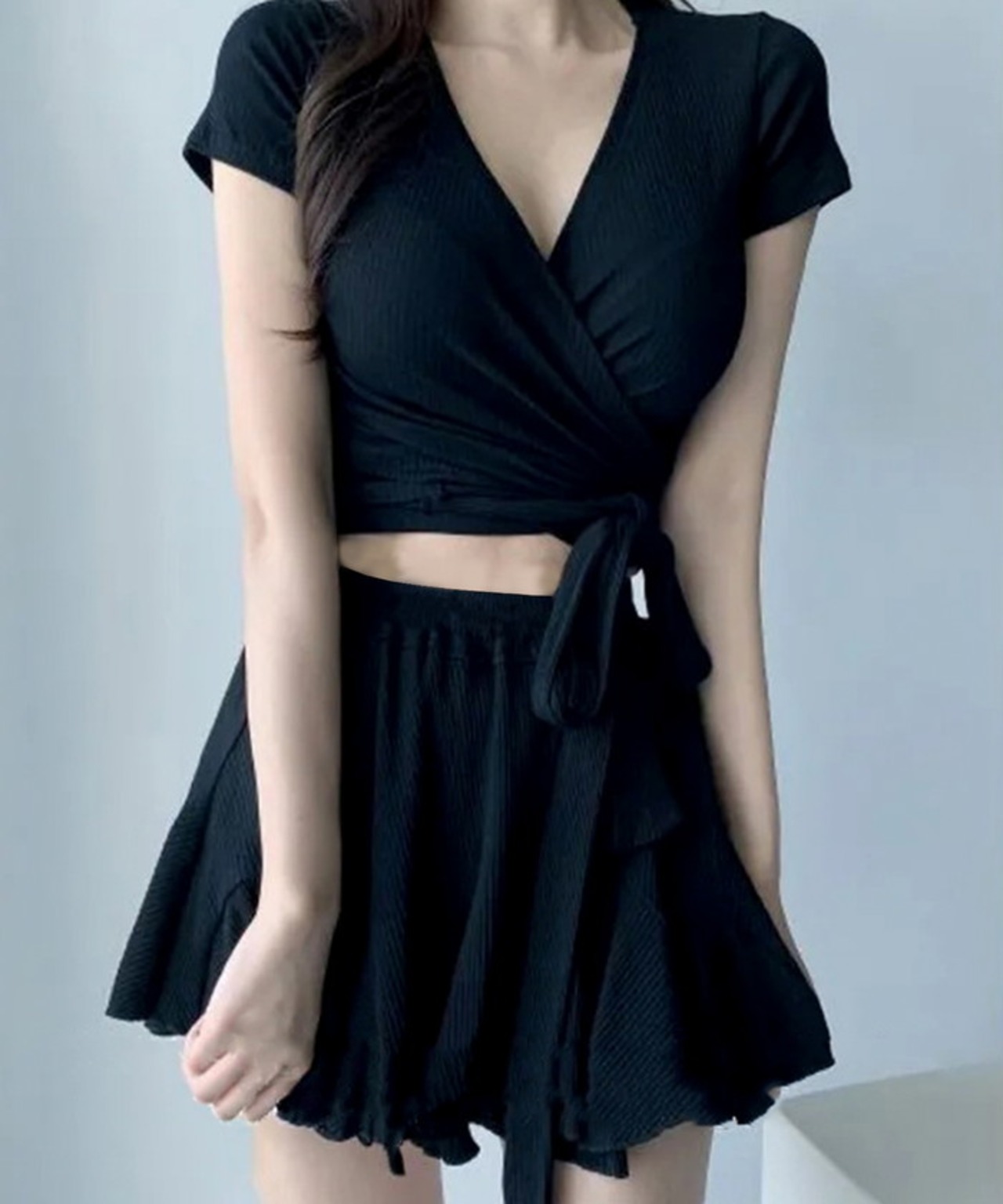 ・深めに入ったVネックはデコルテを美しく見せ、フリルやギャザーを使った女性らしいスカートもはガーリーさを演出。