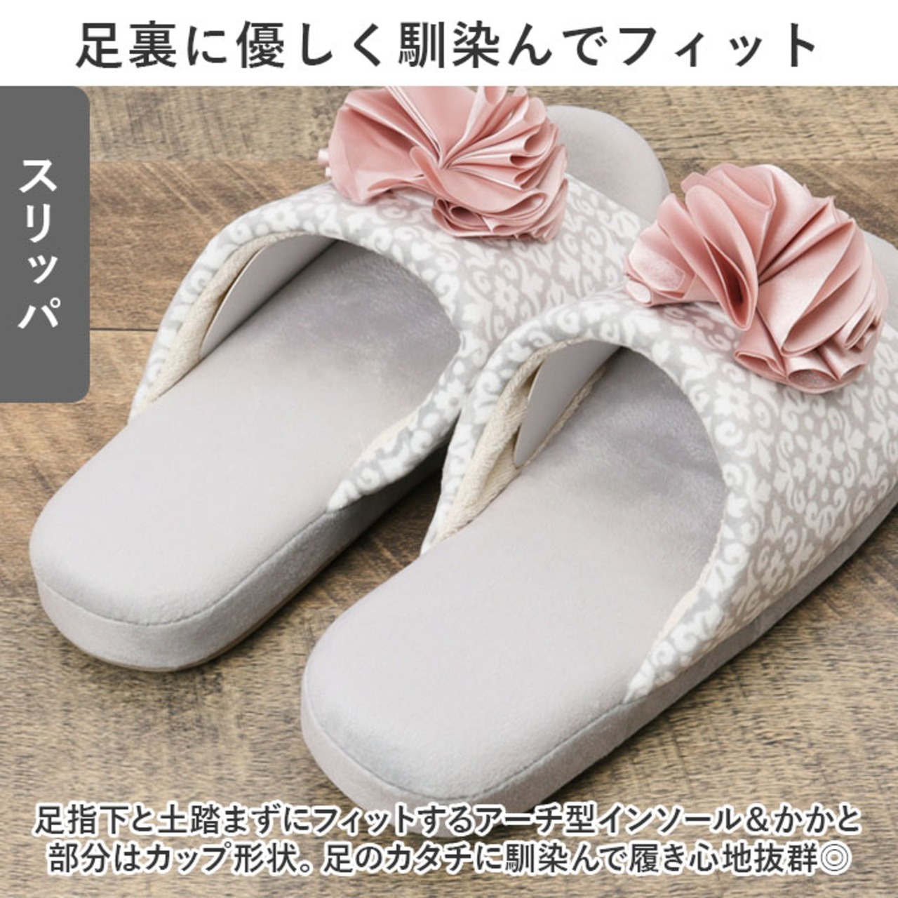 ・ペーパーホルダーカバーとスリッパは、立体的なサテンのコサージュや一部のオーナメント柄がアクセント。