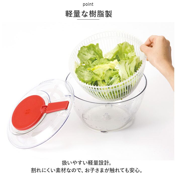・水洗いした野菜をザルに入れ、ボウルにセット。フタをして、ハンドルを握って回転させるだけ!