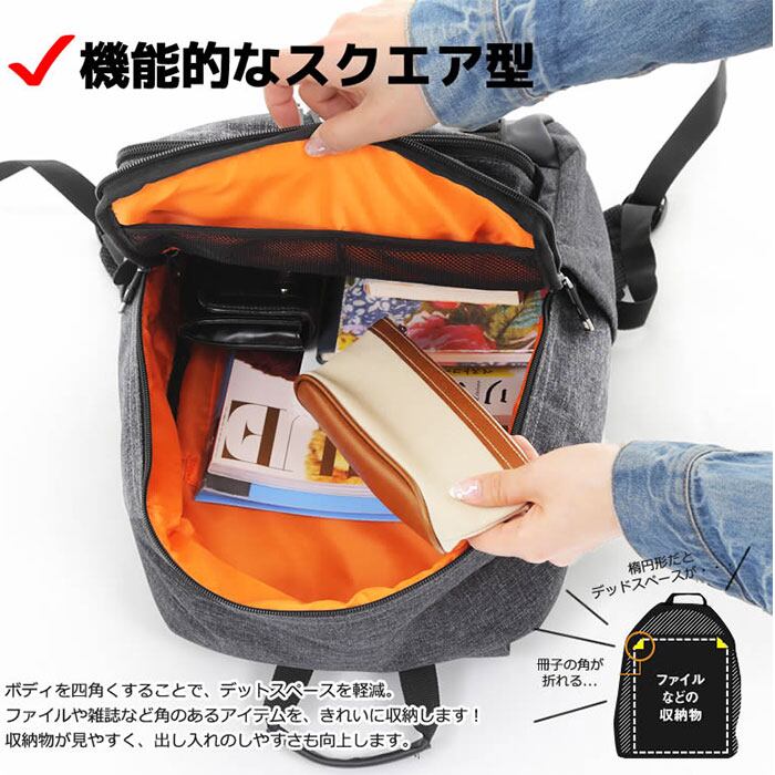 ・スクエアタイプなのでラウンドタイプのリュックに比べ、デッドスペースが少なくA4の書類などもきれいに収納することが出来る