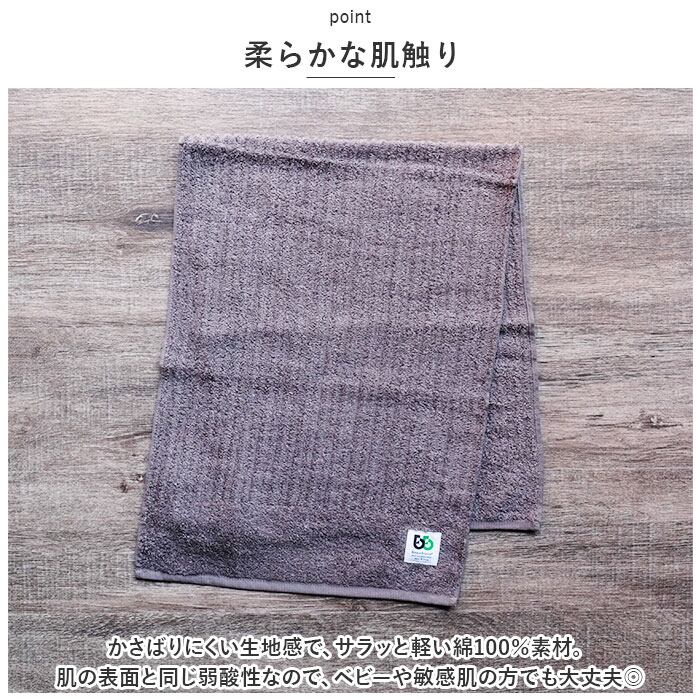 ・かさばりにくい生地感で、サラッと軽い綿100%素材。肌の表面と同じ弱酸性なので、ベビーや敏感肌の方でも大丈夫◎