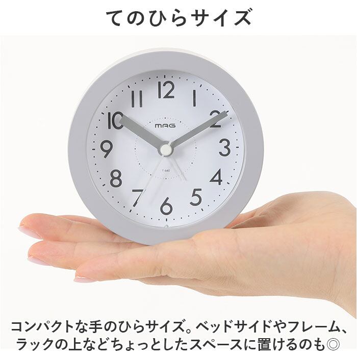 ・ベーシックなカラーを基調としたシンプルなデザイン。丸いフォルムの優しい雰囲気が寝室だけでなくリビングなどの置時計としてもマッチ。インテリアによく馴染む。