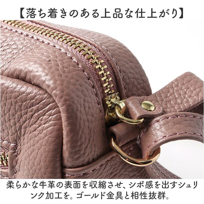 ・柔らかな牛革の表面を収縮させ、シボ感を出すシュリンク加工を。ゴールド金具と相性抜群。