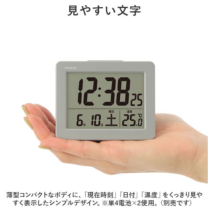 ・薄型コンパクトなボディに、「現在時刻」「日付」「温度」をくっきり見やすく表示したシンプルデザイン。※単4電池×2使用。(別売です)