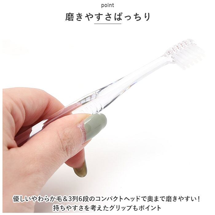 ・優しいやわらか毛&3列6段のコンパクトヘッドで奥まで磨きやすい!持ちやすさを考えたグリップもポイント。