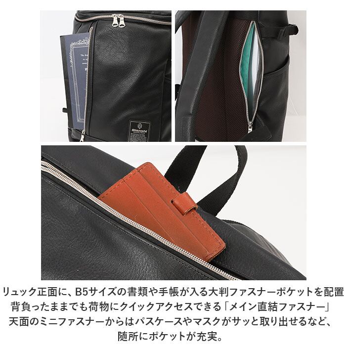 ・リュック正面に、B5サイズの書類や手帳が入る大判ファスナーポケットを配置したほか、天面のミニファスナーからはパスケースやマスクがサッと取り出せるなど、随所にポケットが充実。