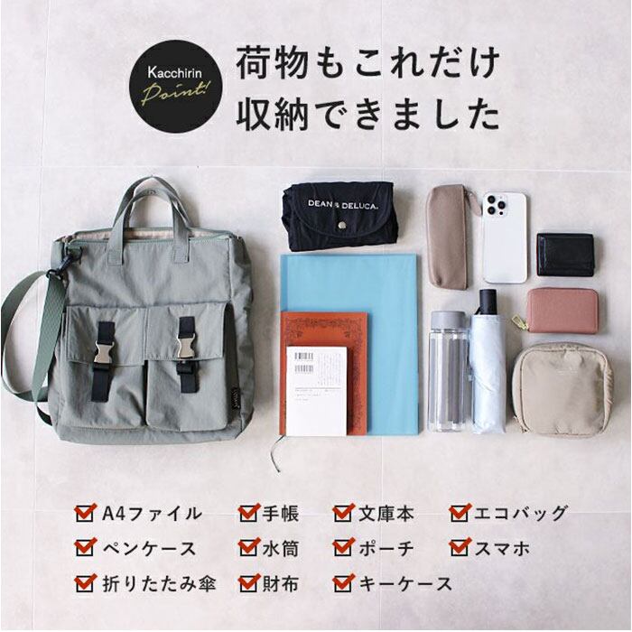 ・A4がすっぽり。程よいマチで、ポーチやドリンクボトルなどお出かけに必要な荷物が1つに。
