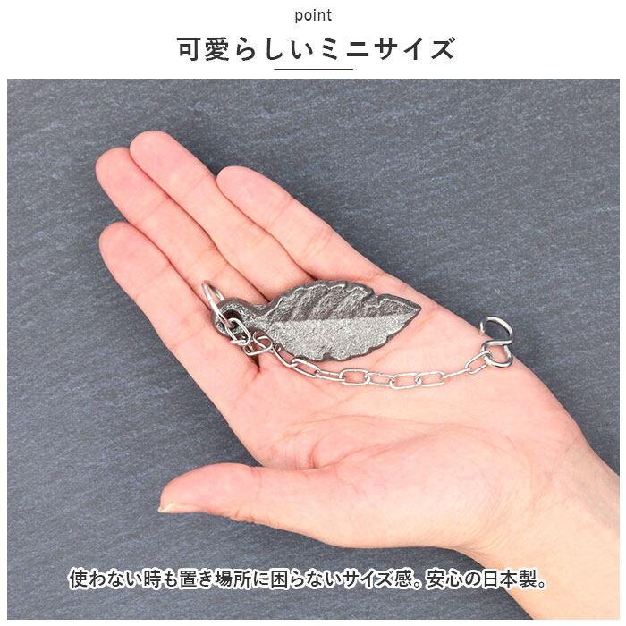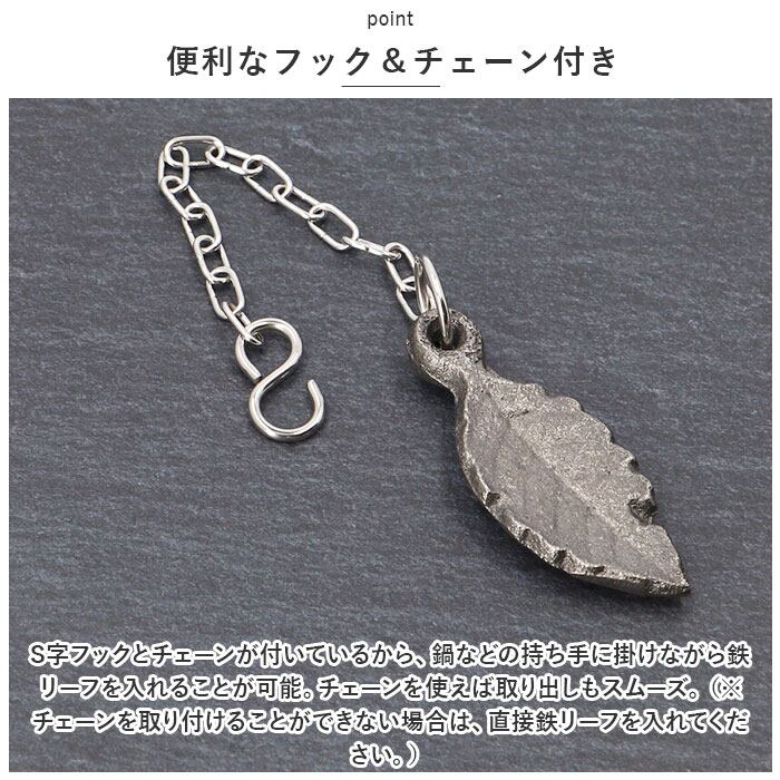 ・S字フックとチェーンが付いているから、鍋などの持ち手に掛けながら鉄リーフを入れることが可能。チェーンを使えば取り出しもスムーズ。(※チェーンを取り付けることができない場合は、直接鉄リーフを入れてください。)