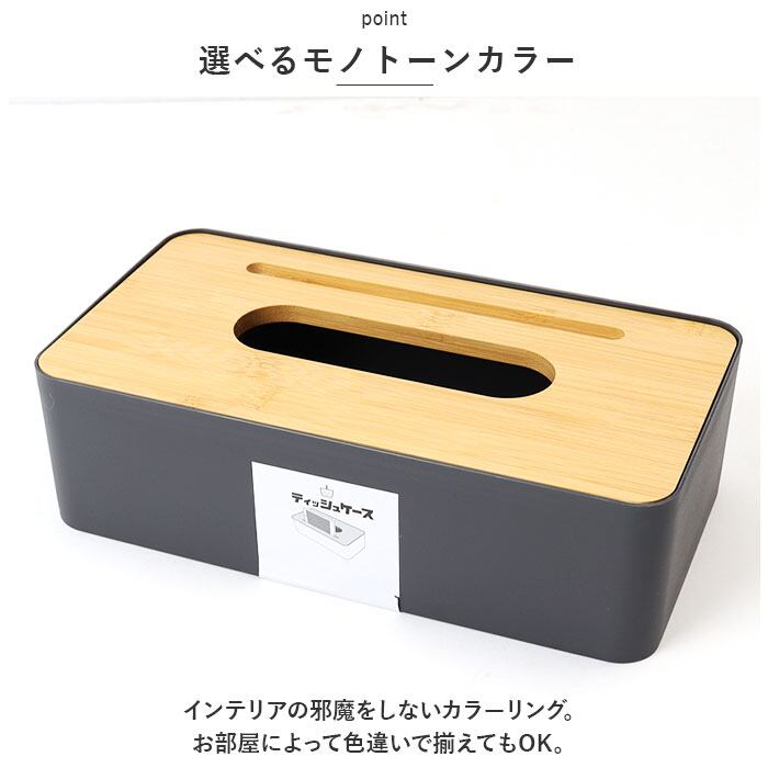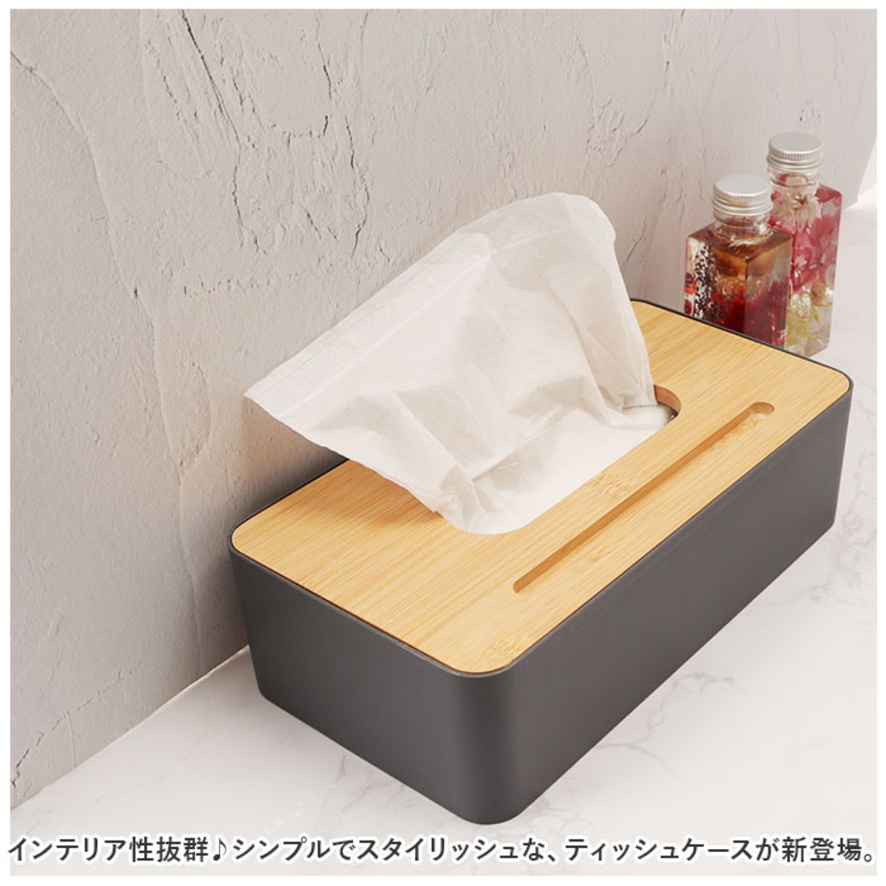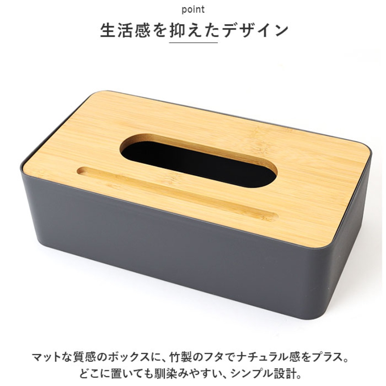 ・マットな質感のボックスに、竹製のフタでナチュラル感をプラス。どこに置いても馴染みやすい、シンプル設計。