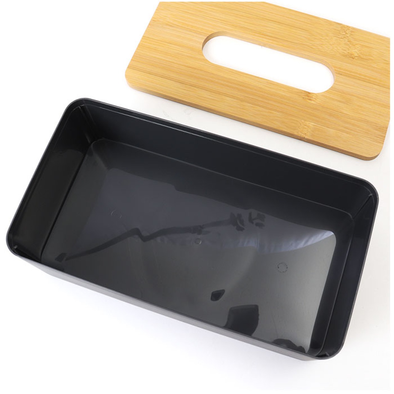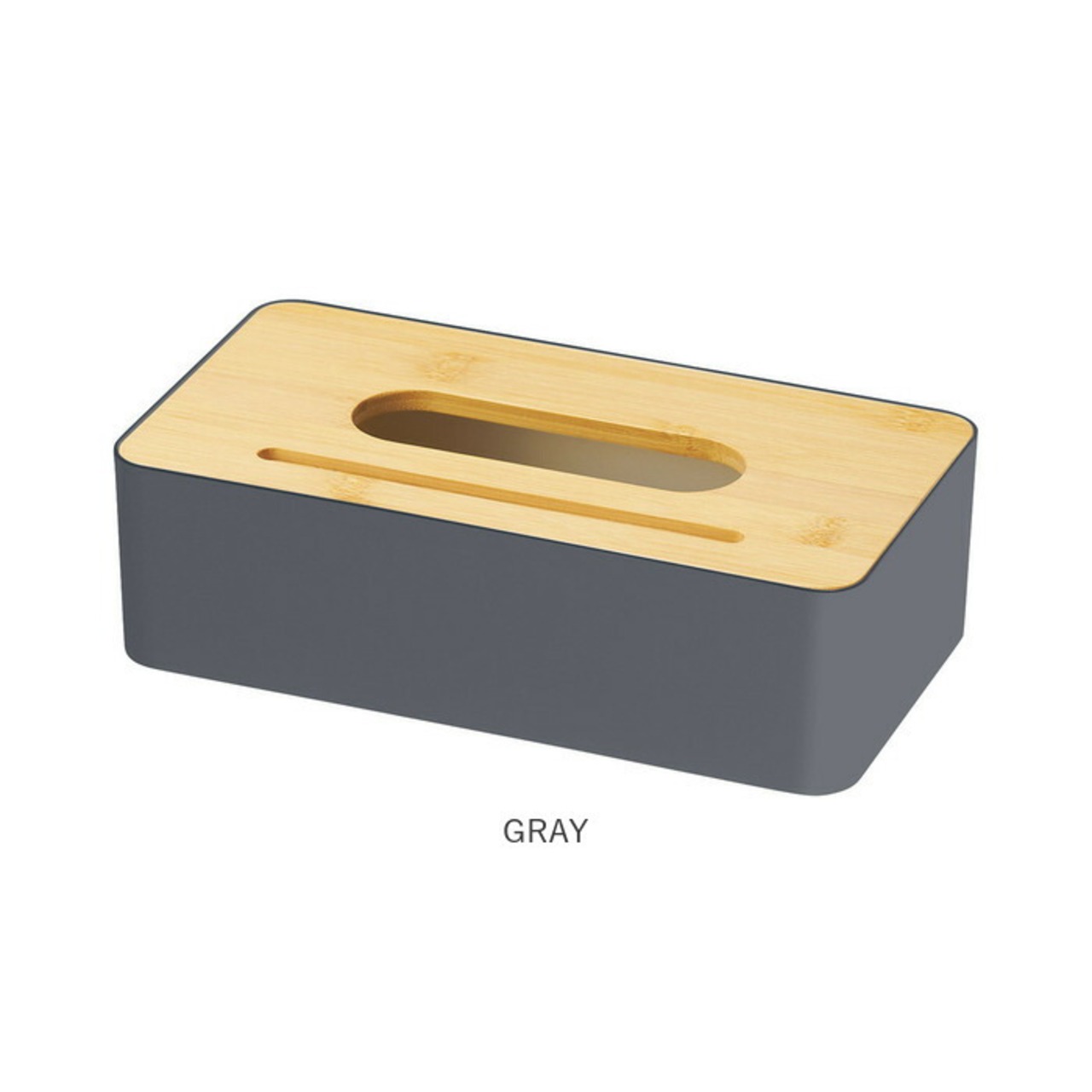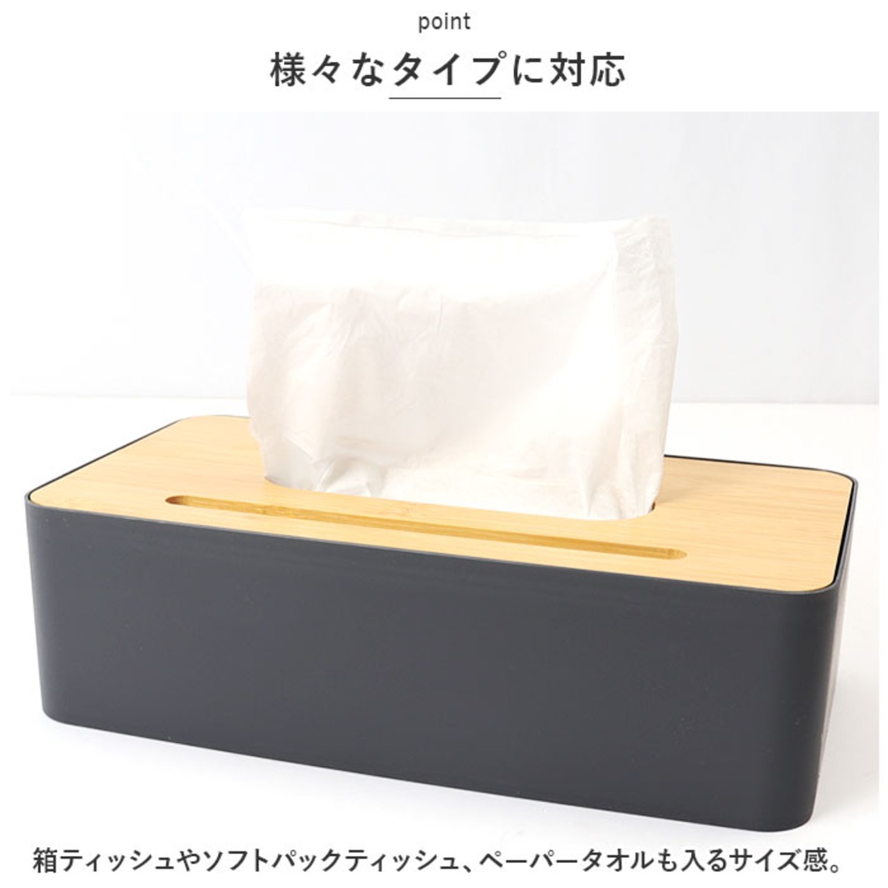 ・マットな質感のボックスに、竹製のフタでナチュラル感をプラス。どこに置いても馴染みやすい、シンプル設計。