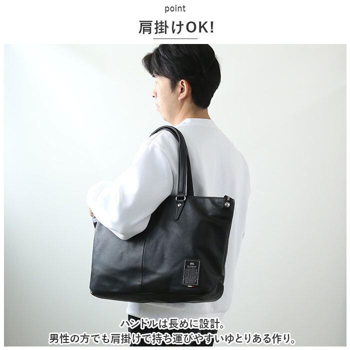 ・ハンドルは長めに設計。男性の方でも肩掛けで持ち運びやすいゆとりある作り。