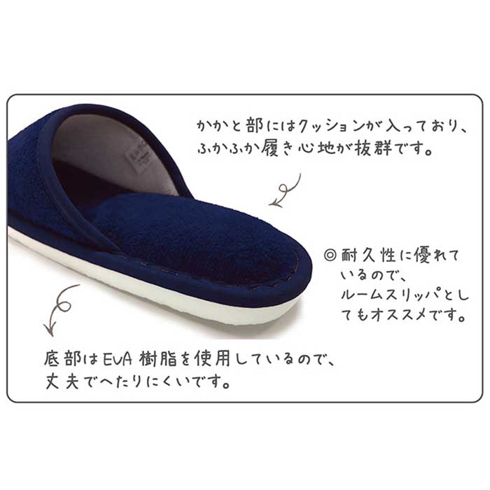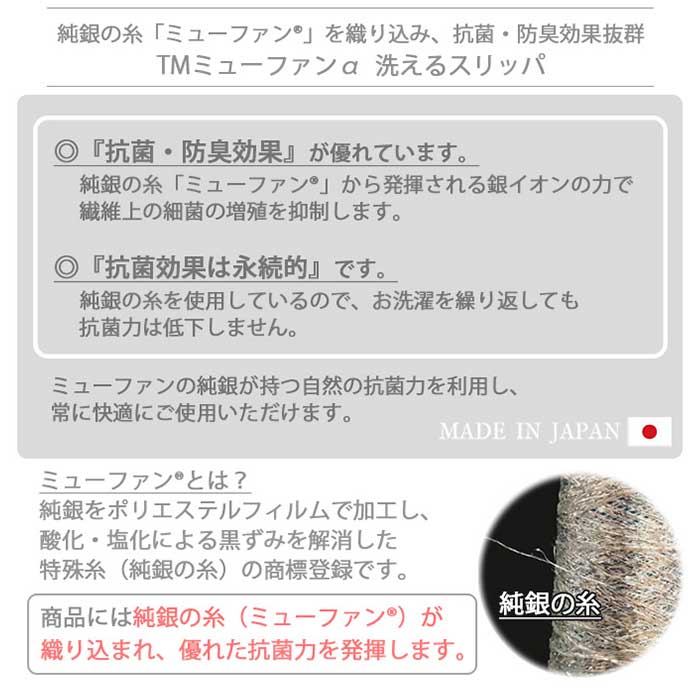 ・純銀の糸ミューファン(R)を織り込んだスリッパ。銀イオンの力で繊維上の細菌の増殖を抑制。人体には安全な”銀”の持つ自然な力を活用しているので安心。