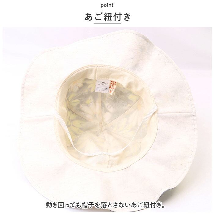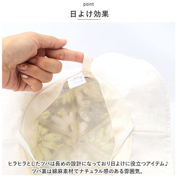 ・ヒラヒラとしたツバは長めの設計になっており日よけに役立つアイテム♪ツバ裏は綿麻素材でナチュラル感のある雰囲気。