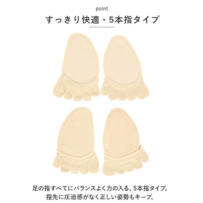 ・指の開いた5本指デザインに、クッション部分は肌触りのよいパイル毛で仕上げ、蒸れやすい指先がいつでも爽やか。