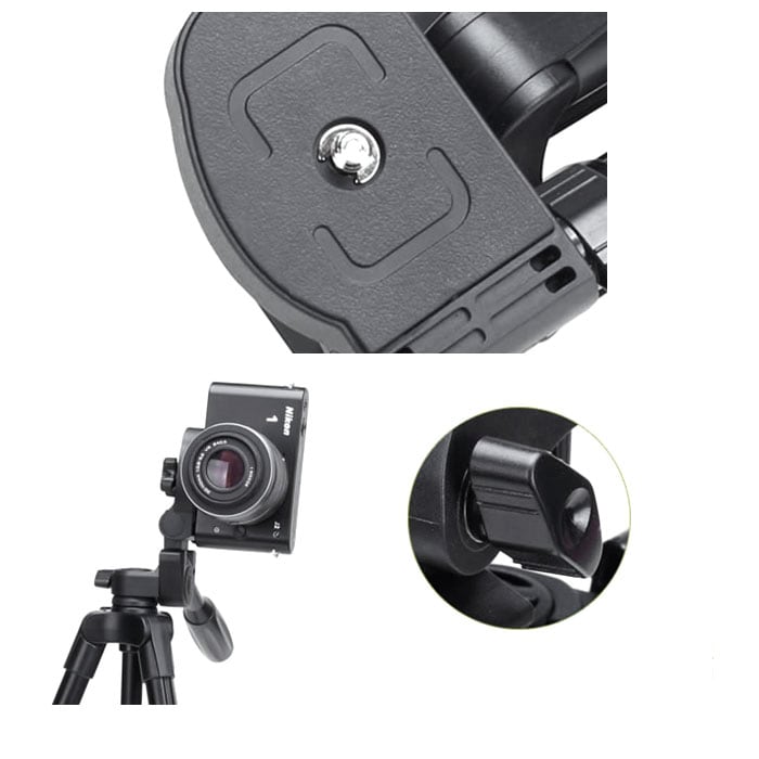 ・トップの雲台には一眼レフやコンパクトデジタルカメラはもちろん、お手持ちのスマホホルダーまで、1/4インチネジで取り付けが可能な3WAYタイプ。(※スマホホルダーは付属していません。)
