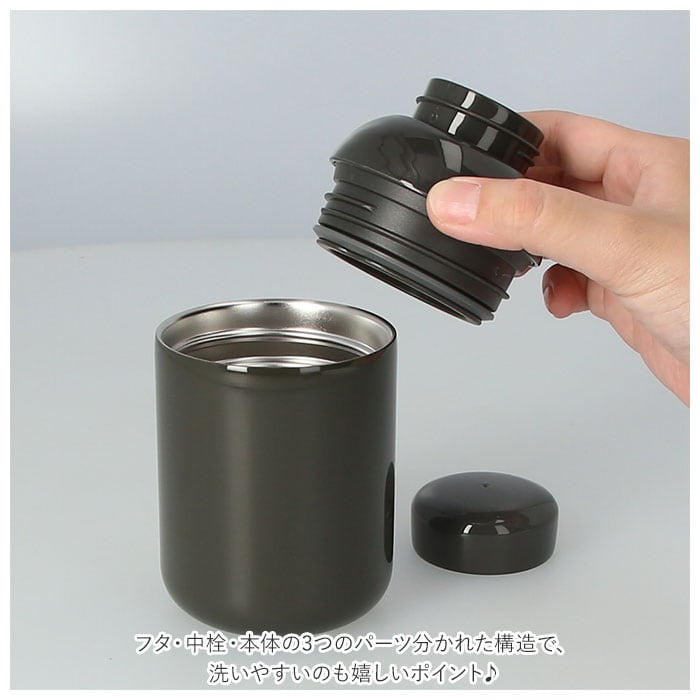 ・フタ・中栓・本体の3つのパーツ分かれた構造で、洗いやすいのも嬉しいポイント。