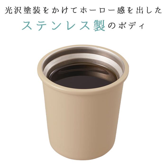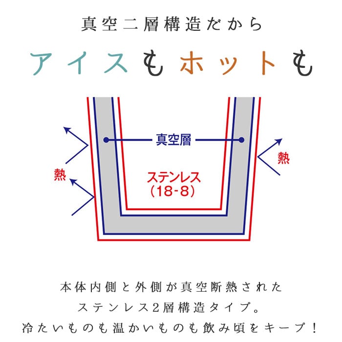 ・本体内側と外側が真空断熱された、ステンレス2層構造タイプ。冷たいものも温かいものも飲み頃をキープ!