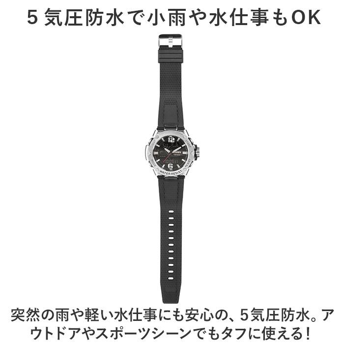 ・突然の雨や軽い水仕事にも安心の、5気圧防水。アウトドアやスポーツシーンでもタフに使える!
