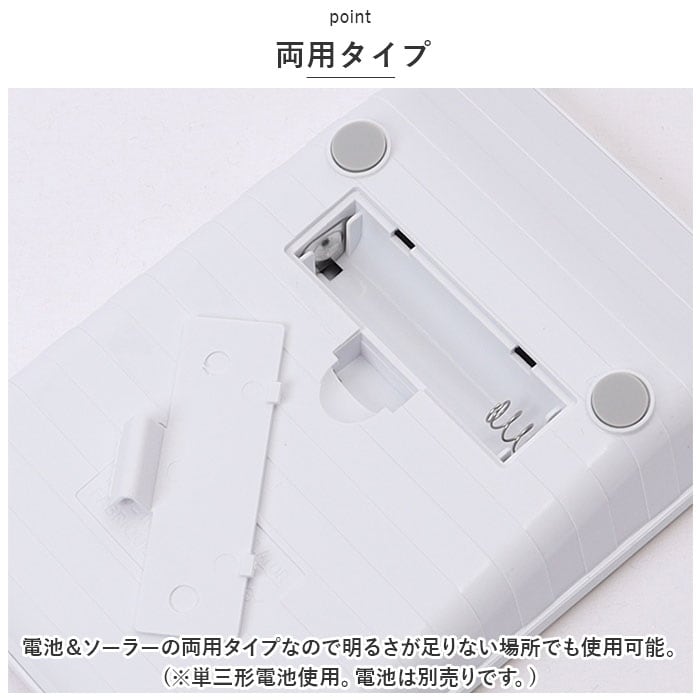 ・電池&ソーラーの両用タイプなので明るさが足りない場所でも使用可能。(※単三形電池使用。電池は別売りです。)