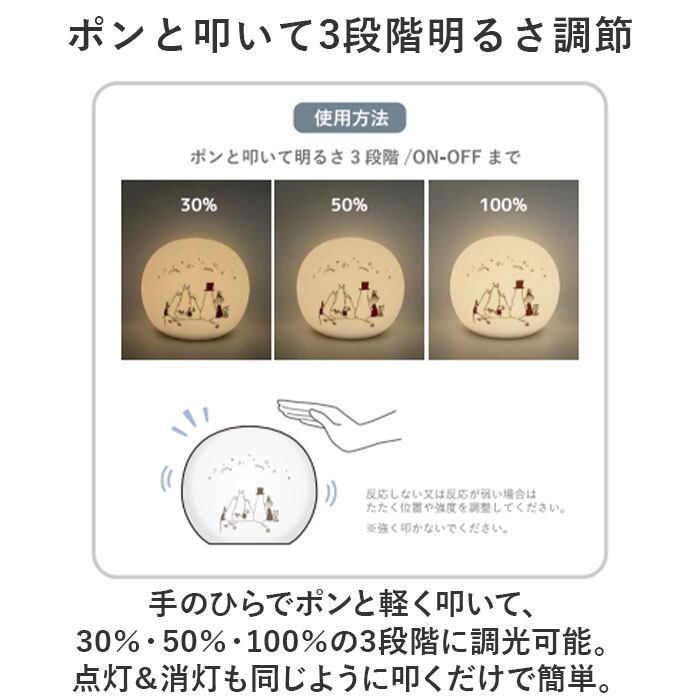 ・手のひらでポンと軽く叩いて、30%・50%・100%の3段階に調光可能。点灯&消灯も同じように叩くだけで簡単。