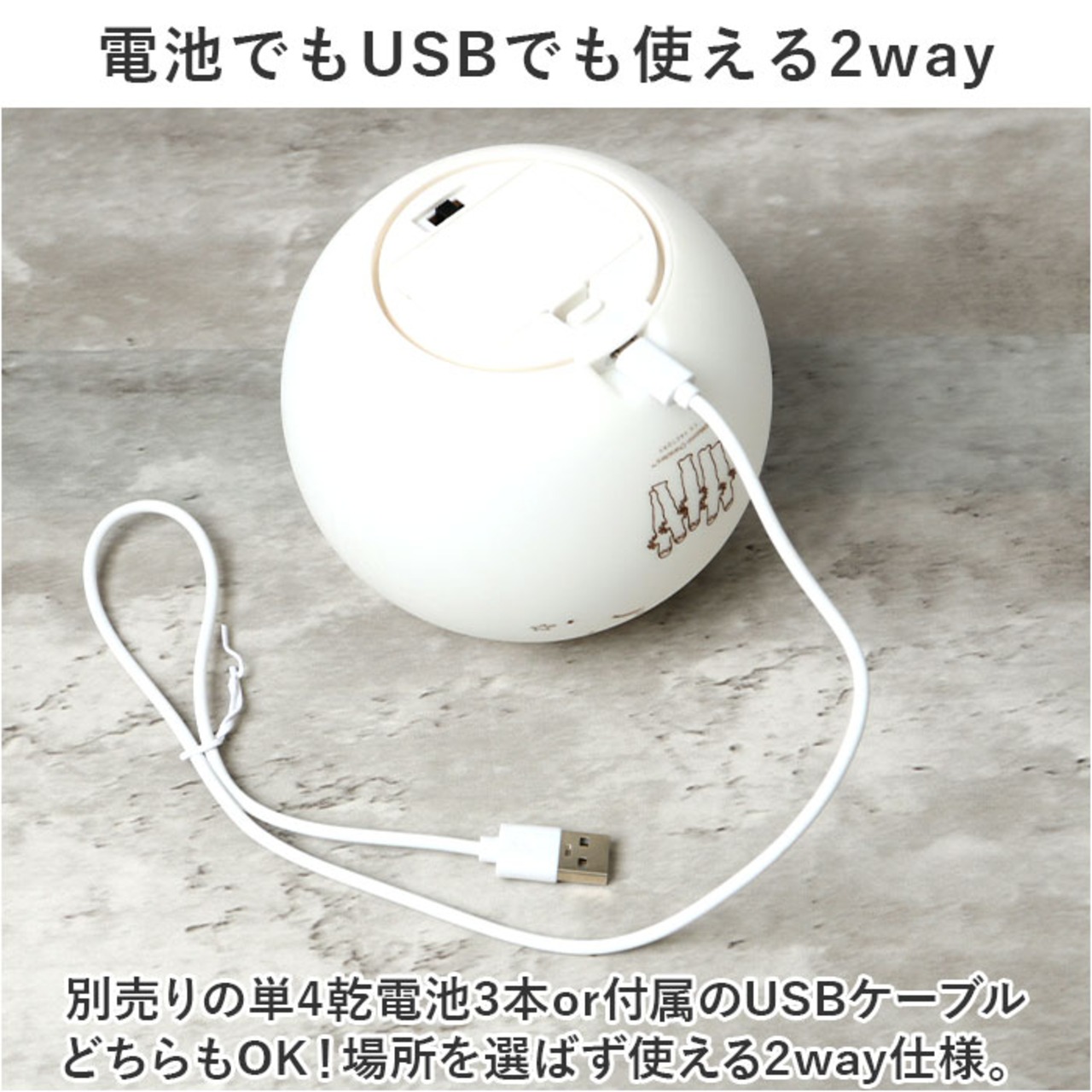 ・別売りの単4乾電池3本or付属のUSBケーブルどちらもOK!場所を選ばず使える2way仕様。
