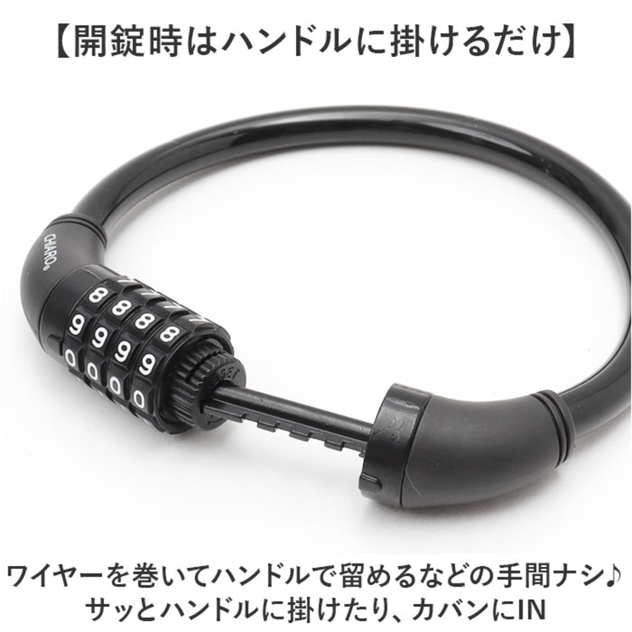 ・ワイヤーを巻いてハンドルで留めるなどの手間ナシ♪サッとハンドルに掛けたり、カバンにIN