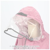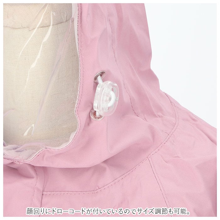 ・フード前面は大きめの透明窓になっているから、フードを被っても視界を遮る心配なし。顔回りにドローコードが付いているのでサイズ調節も可能。