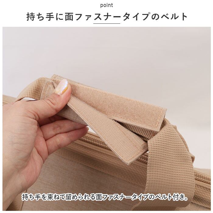 ・持ち手を束ねて留められる面ファスナータイプのベルト付き。