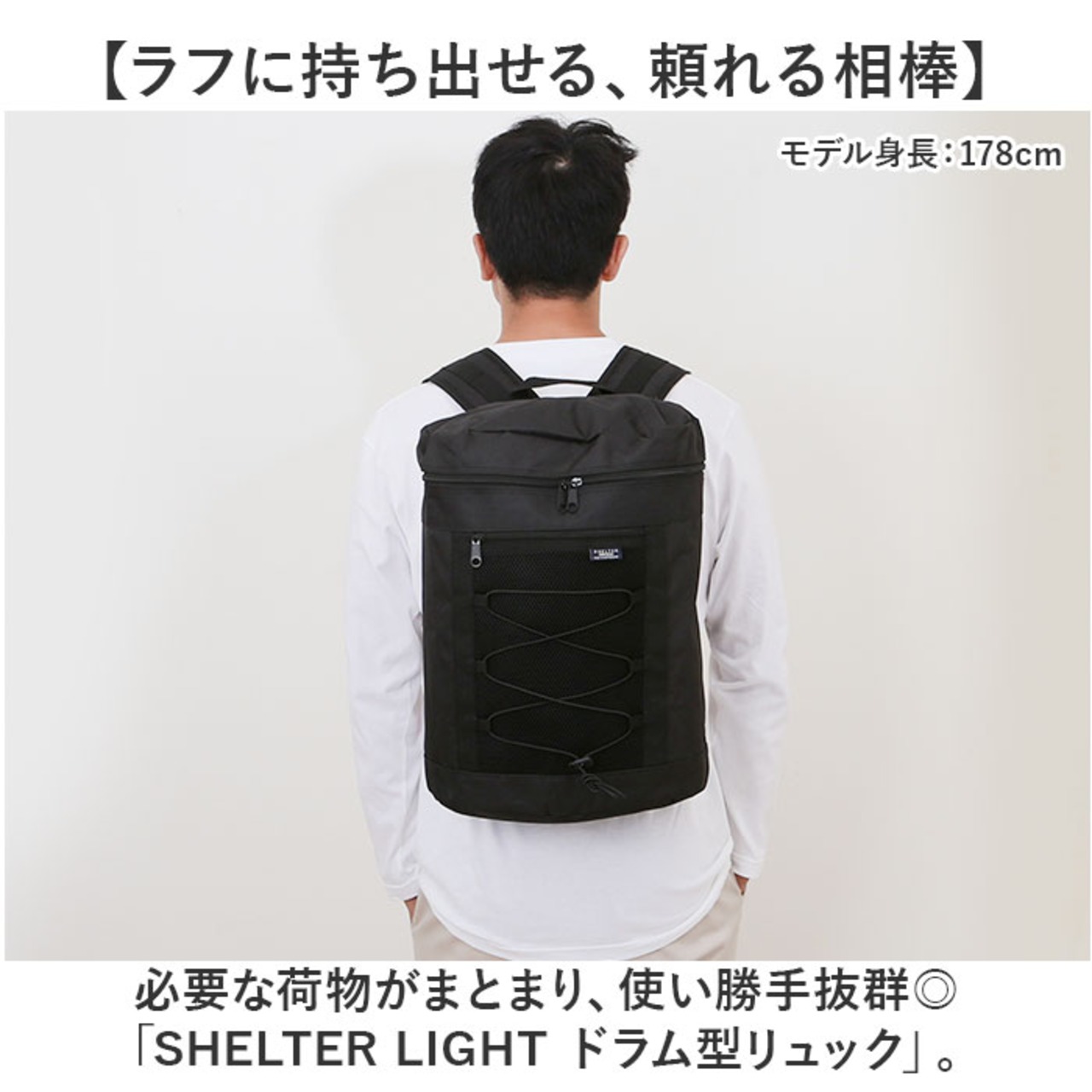 ・必要な荷物がまとまり、使い勝手抜群◎「SHELTER LIGHT ドラム型リュック」。