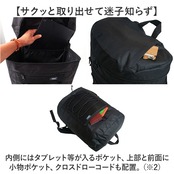 ・内側にはタブレット等が入るポケット、上部と前面に小物ポケット、クロスドローコードも配置。
