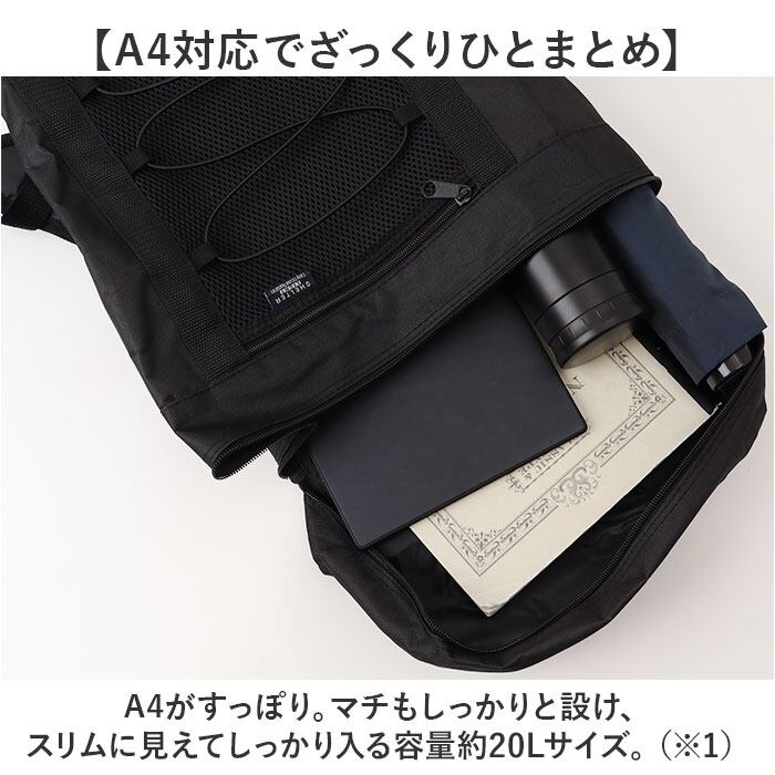 ・A4がすっぽり。マチもしっかりと設け、スリムに見えてしっかり入る容量約20Lサイズ。