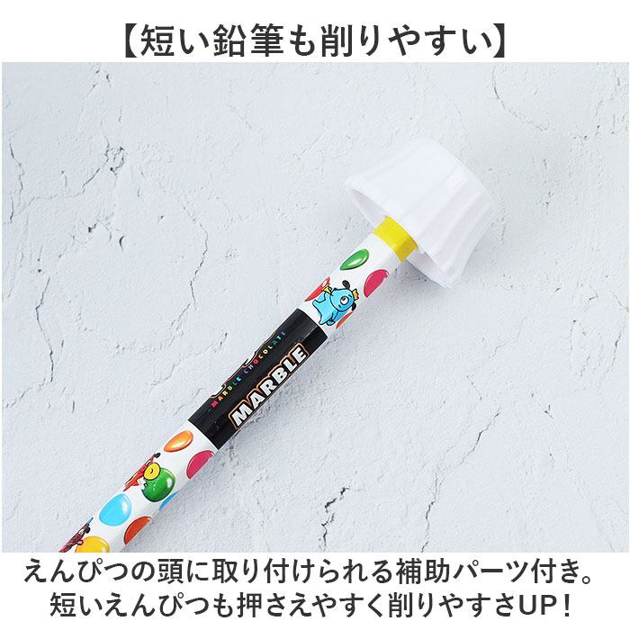 ・えんぴつの頭に取り付けられる補助パーツ付き。短いえんぴつも押さえやすく削りやすさUP!
