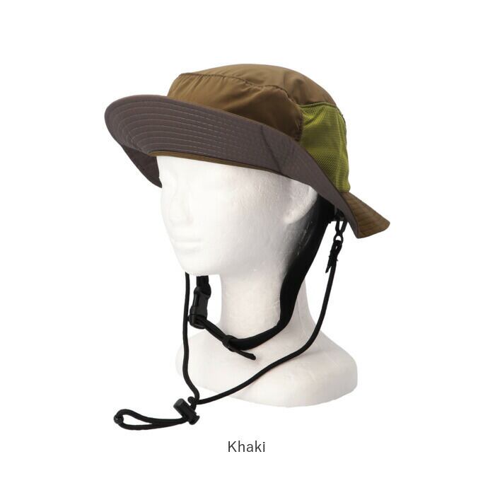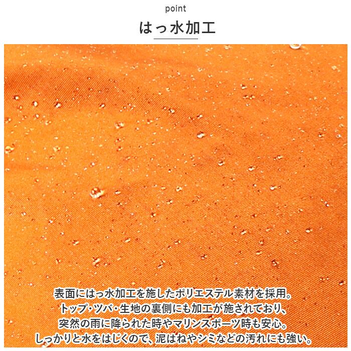 ・表面にはっ水加工を施したポリエステル素材を採用。トップ・ツバ・生地の裏側にも加工が施されており、突然の雨に降られた時やマリンスポーツ時も安心。しっかりと水をはじくので、泥はねやシミなどの汚れにも強い。
