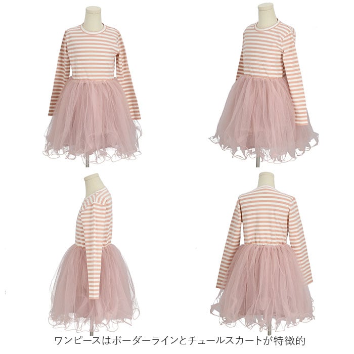 ・ワンピースはボーダーラインとチュールスカートが特徴的。スカート部分のボリューミーなチュールがふんわり感を演出し女の子らしいデザインに。