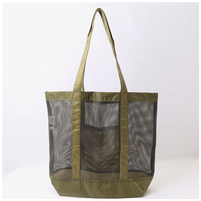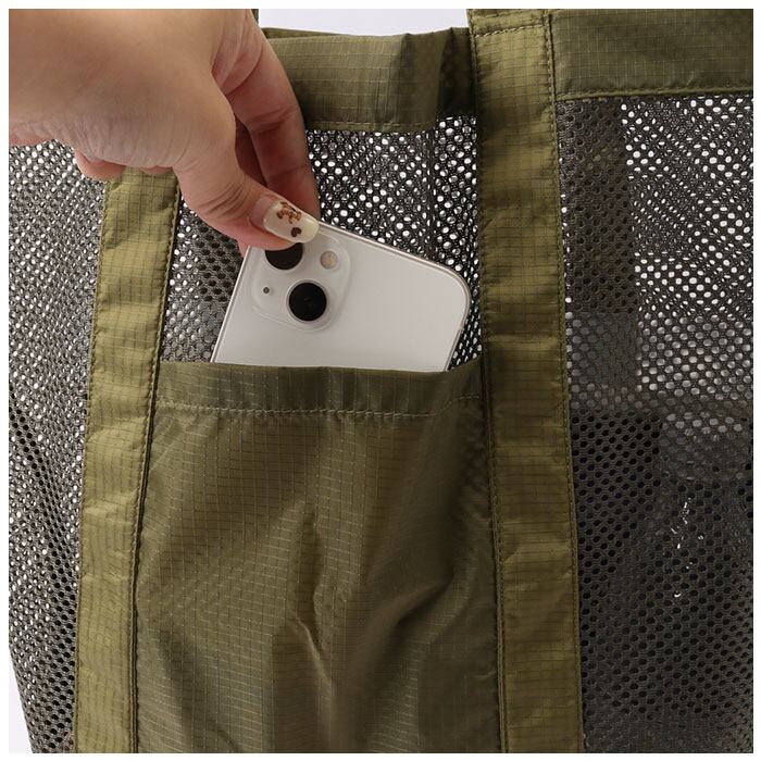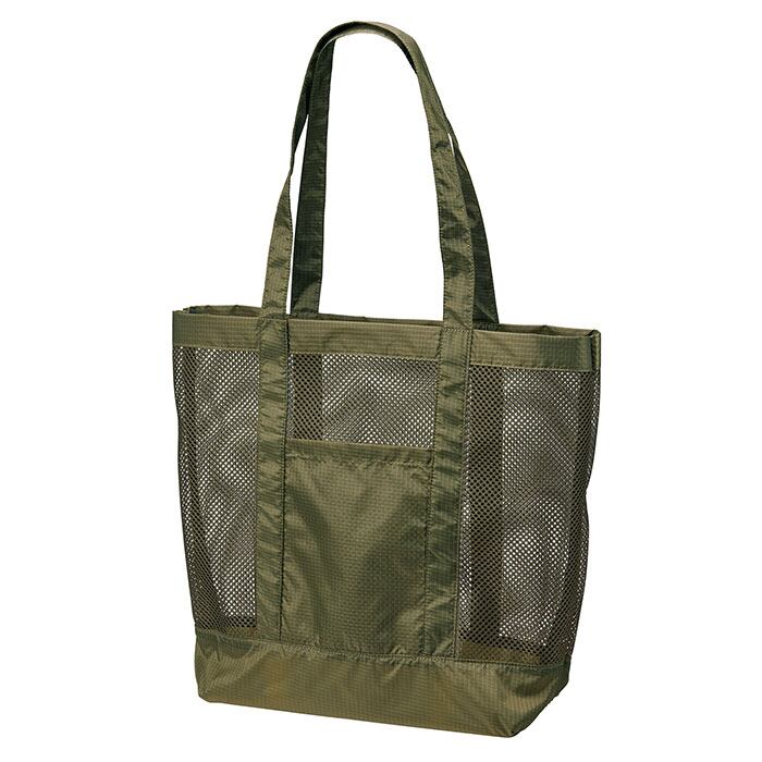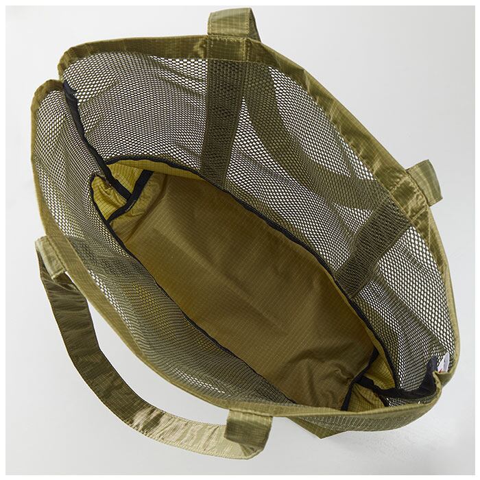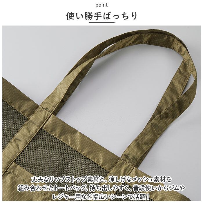 ・丈夫なリップストップ素材と、涼しげなメッシュ素材を組み合わせたトートバッグ。持ち出しやすく、普段使いからジムやレジャー用など幅広いシーンで活躍!