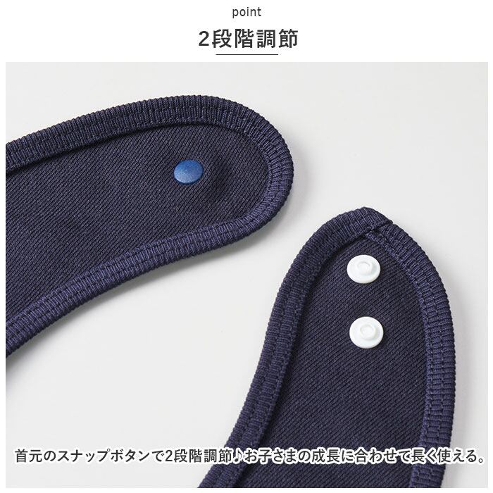 ・首元のスナップボタンで2段階調節♪お子さまの成長に合わせて長く使える。