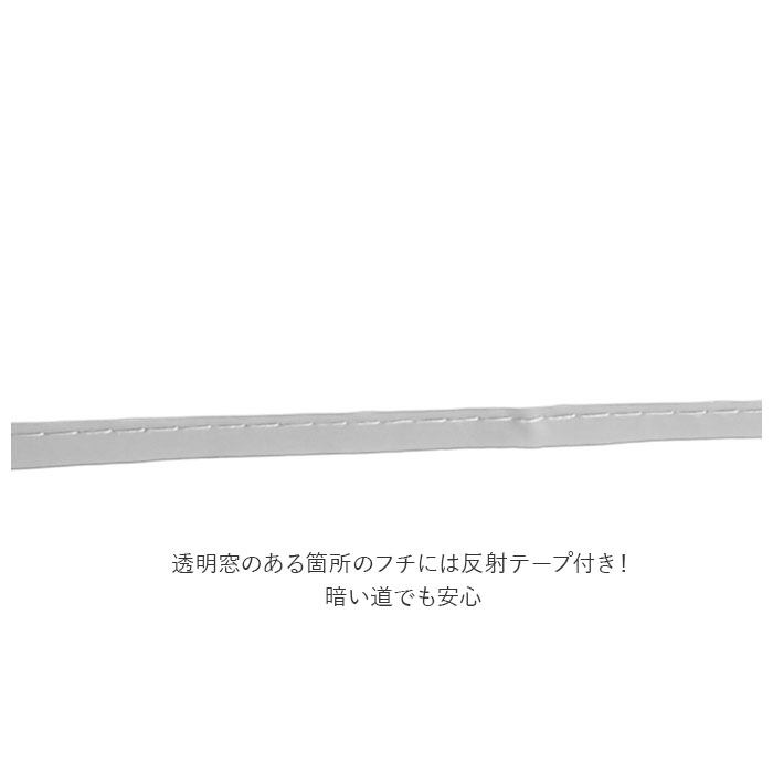 ・前も後ろもしっかり見える透明窓が付いていて、透明窓のある箇所のフチには反射テープ付き!暗い道でも安心。